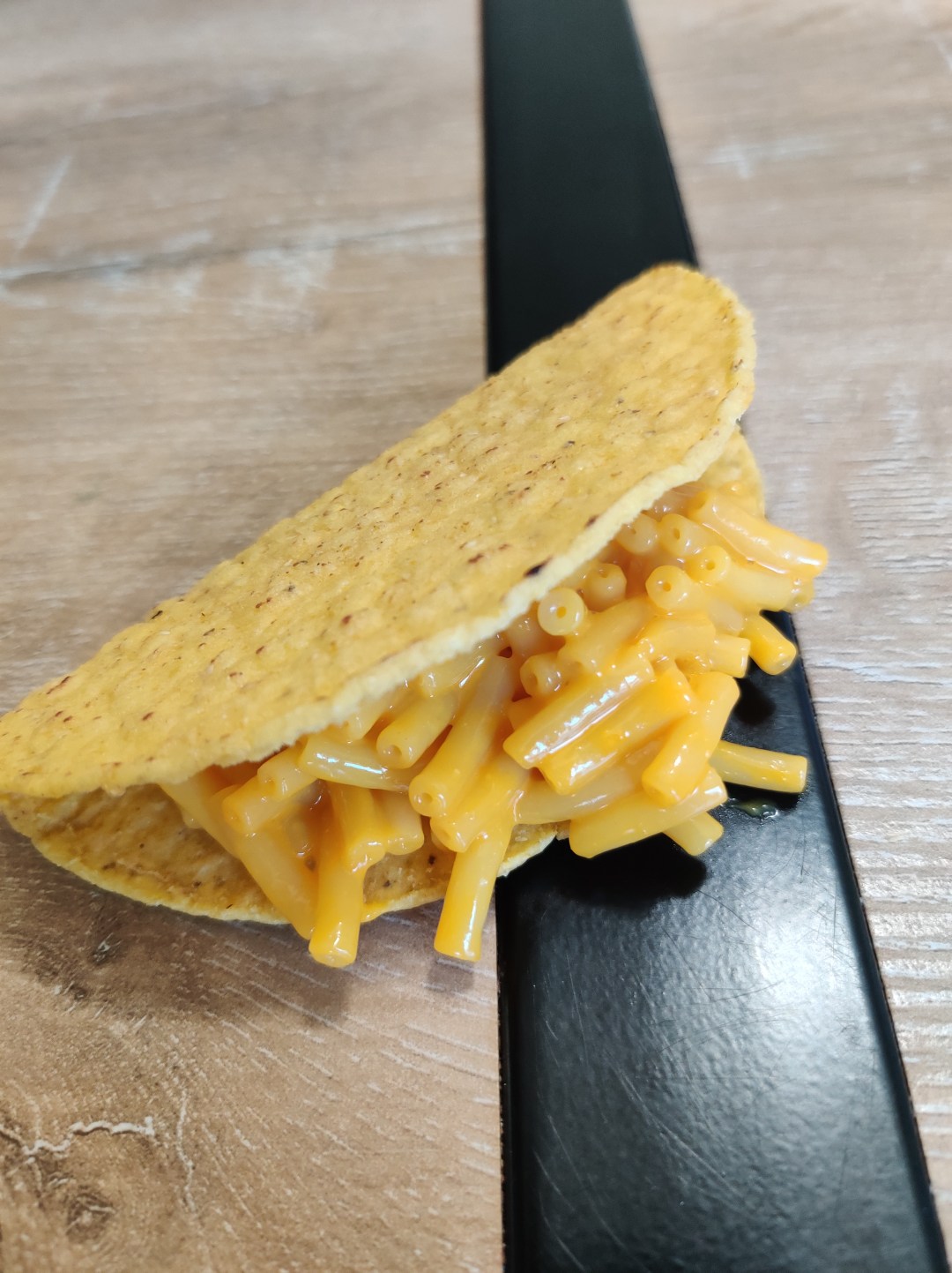 I put the taco shell on his plate with his macaroni, and let him know it was just a challenge item. He knows by now that he is not required to eat it, so he wasn’t worried. He sniffed the shell, and noticed it didn’t have much of a smell at all. He touched it, and noticed the texture was just like Doritos. Eventually, I encouraged him to give it a little lick. He did, and he didn’t mind it. It was just a salty chip. I suggested perhaps he could break the shell, and use it to scoop up some macaroni like a spoon, but he did me one better. He scooped a couple spoonfuls into the shell and ate it like a taco, how everyone else at the table was eating it!