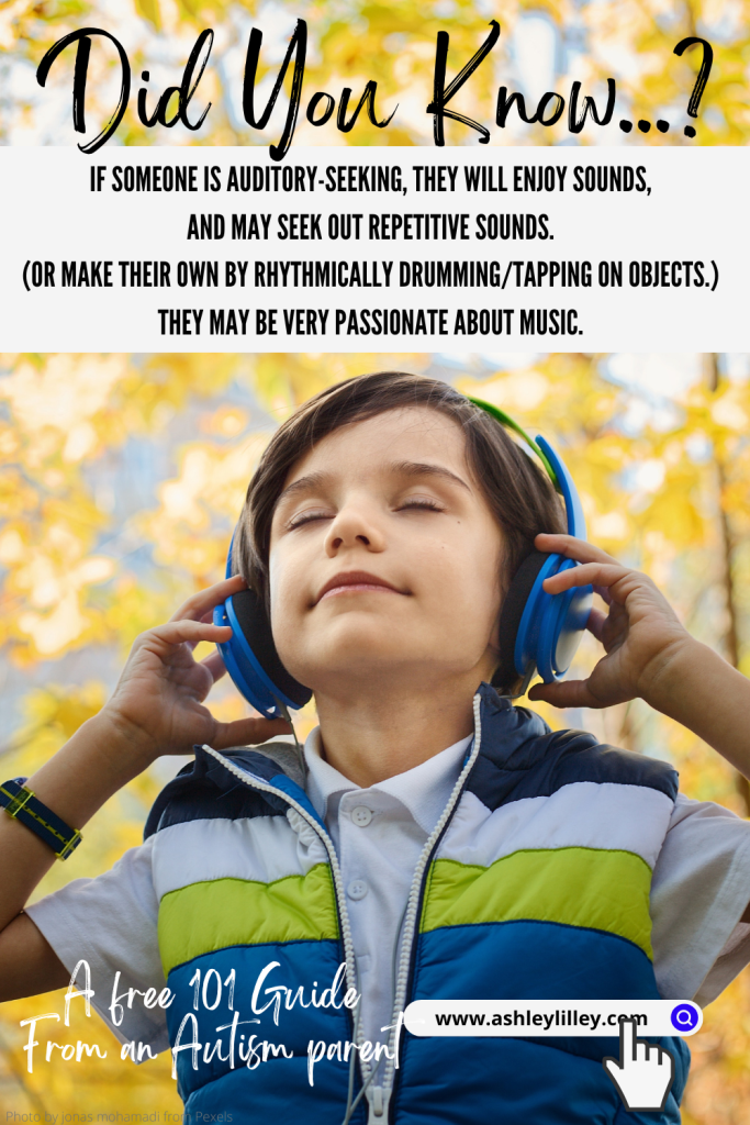 If someone is auditory-seeking, they will enjoy sounds, and may seek out repetitive sounds.(Or make their own by rhythmically drumming/tapping on objects.) They may be very passionate about music.