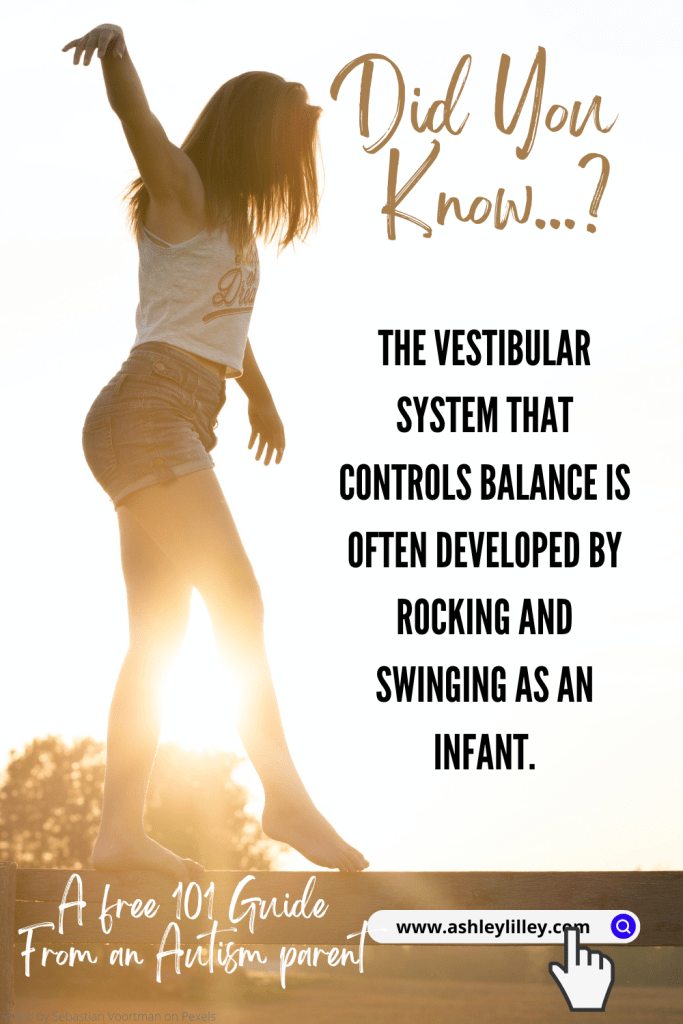 The back and forth rocking sensation helps develop vestibular awareness. Many people develop their vestibular awareness in the rocking chair on mom’s lap as an infant. People that require more development can use a variety of rocking devices: